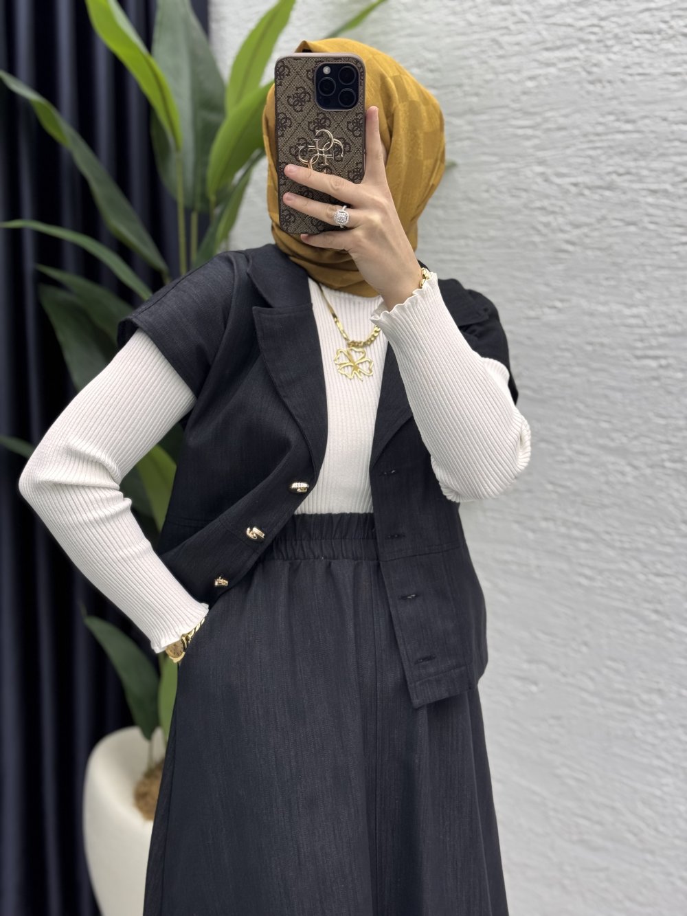 İster kemerli ister kemersiz kullanabileceğiniz etek yelek takımımız satışta