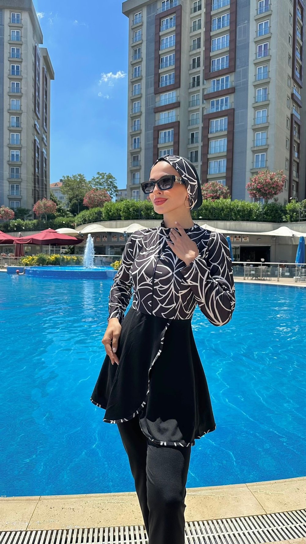 Desenli tunik hakim yaka önden yarım boy fermuarlıdır ve etek görünümü detaylıdır denizde havuzda açılma yapmaz iç göstermez pantolon belden lastiklidir tesettüre uygun üretilmiştir