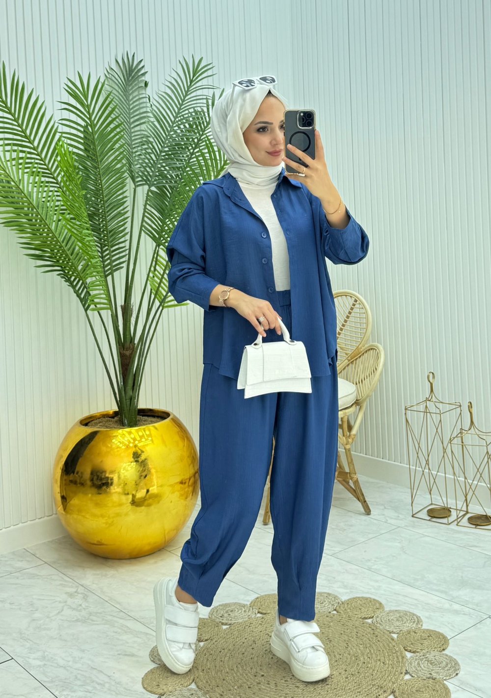 Tunik boydan düğmeli salaş kesimdir pantolon belden lastiklidir ve şalvar kesime sahiptir