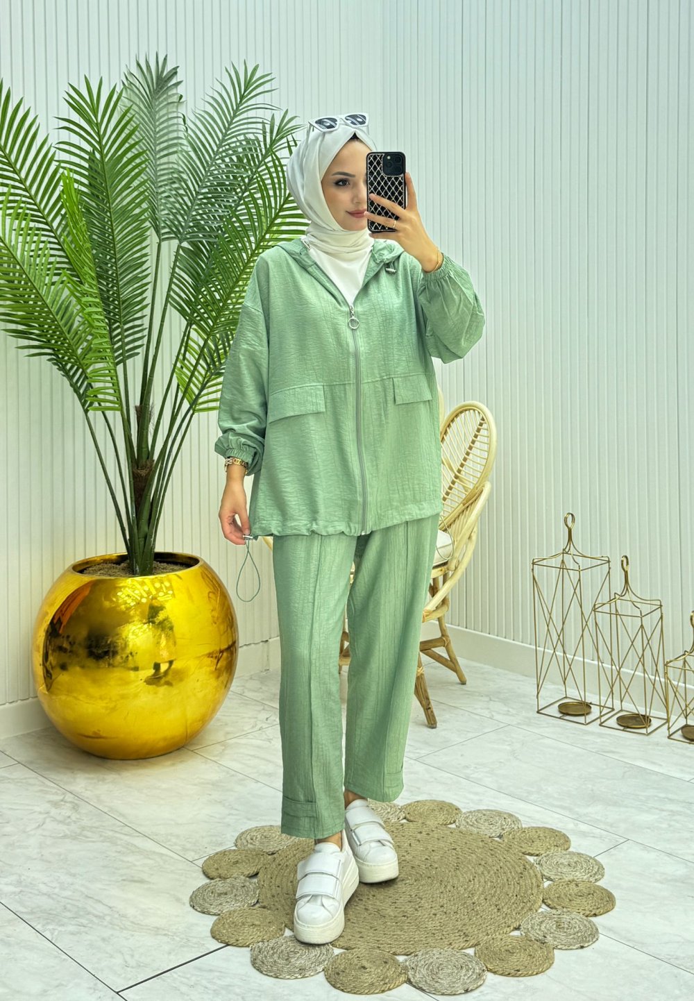 Tunik boydan fermuarlı, kapüşonlu ve cep kapaklıdır.